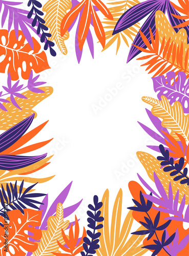 © Utro na more, Fototapeta premium Tropical leaves. Vector frame in scandinavian style. Hand drawn background. Poster in orange and violet colors with place for text.