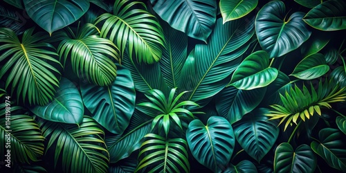 © Nasnunt, Naklejka premium Tropical leaves with dark jungle background, color toned, tropical, leaves, jungle, background, dark, color toned, green, lush
