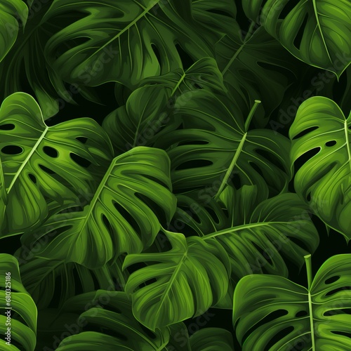 Obraz premium Tropical monstera leaf seamless pattern with lush green foliage on a captivatingly dark background