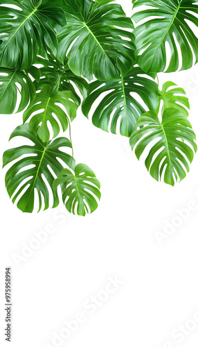 Obraz premium Tropical monstera leaves with a vibrant green hue and intricate patterns