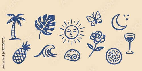 © Victoria, Fototapeta premium Tropical nature doodle elements line art vector illustration