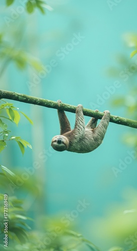 Naklejka premium Tropical Nature Tranquility: Adorable Sloth (Bradypus) Against a Soft,...