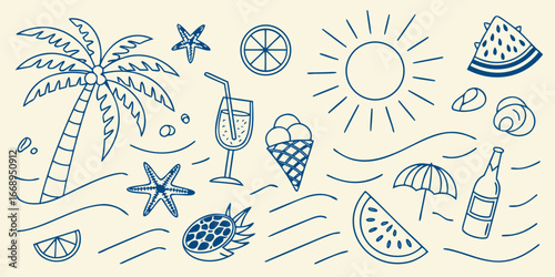 © Aminul, Fototapeta premium tropical nautical line art blue ink palm trees starfish maritime beach illustrations design.