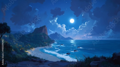 Naklejka premium Tropical Night Beach Scene Under a Full Moon
