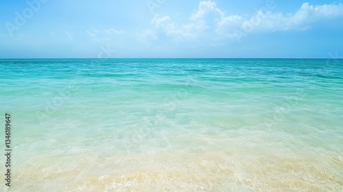 Obraz premium Tropical Ocean Paradise: Tranquil Turquoise Waters Meet Pristine Sandy Beach Under a Bright Blue Sky with Soft Clouds