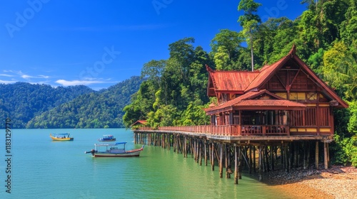 Obraz premium Tropical Overwater House on Stilts with Boats