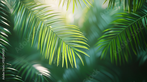 Obraz premium Tropical Palm Fronds: Sunlit branches creating a tranquil, verdant atmosphere. Nature's embrace.