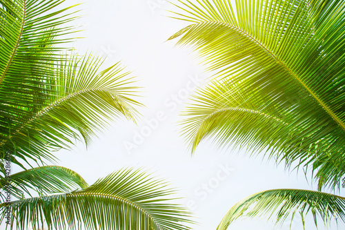 © Nabodin, Naklejka premium tropical palm leaf background, coconut palm trees perspective view