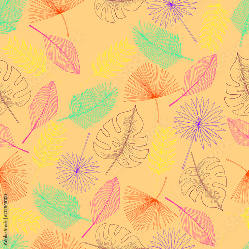 © Olha, Fototapeta premium Tropical palm leaf seamless pattern, peach colour background.