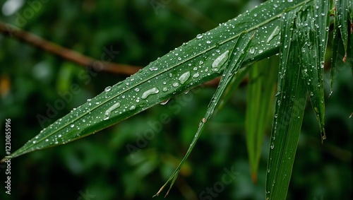 Obraz premium Tropical palm leaf with raindrops in rainforest