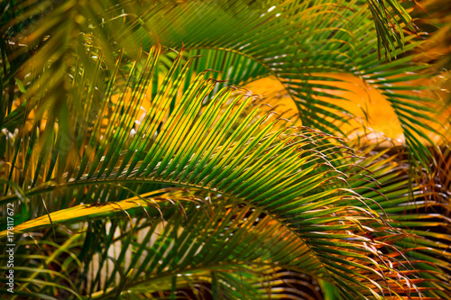 © zozzzzo, Fototapeta premium tropical palm leaves background with lush foliage