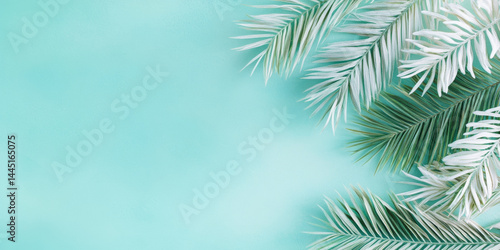 Obraz premium Tropical palm leaves on a vibrant aqua background creating a refreshing summer vibe