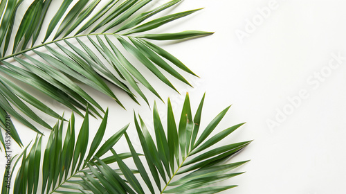 © KotBaton, Naklejka premium Tropical palm leaves on a white background. Summer concept. Flat lay, top view, copy space