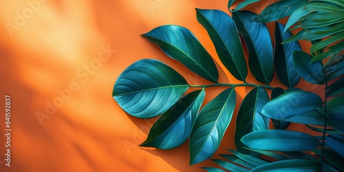 © NeuroCake, Fototapeta premium Tropical palm leaves on an orange background. Summer vacation and exotic nature concept. Design for spa poster, wallpaper, banner with copy space.