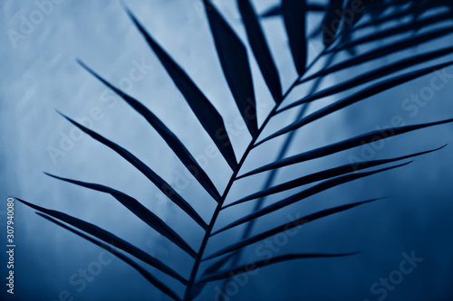 Fototapeta premium Tropical palm leaves on blurred background in blue tones.