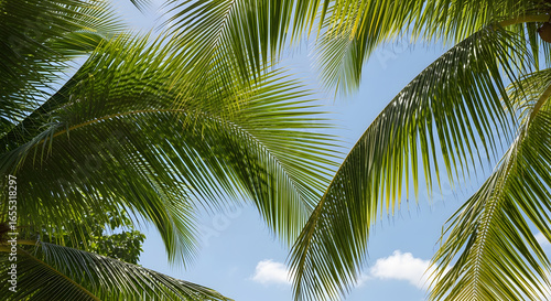 Fototapeta premium Tropical palm leaves with sunlight filtering through, crisp detail, blue sky.