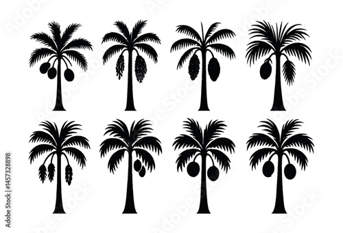 Fototapeta premium Tropical palm silhouette icons set – coconut, fan, date, windmill, sago,...