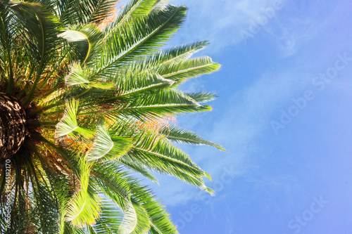 © neirfy, Fototapeta premium tropical palm tree fresh leaves border on blue sky background