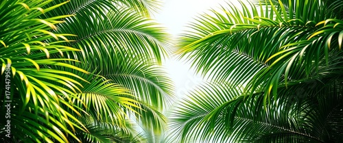 Fototapeta premium Tropical palm tree leaves form a natural frame, vibrant green foliage, fronds, plant