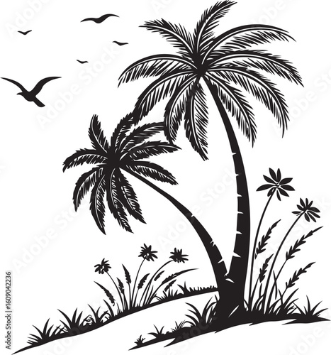 Fototapeta premium Tropical palm tree silhouette on a clean white backdrop perfect for summer...