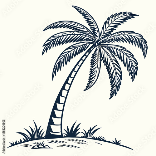 © Abdullah, Obraz premium Tropical Palm Tree Silhouette on Sandy Island Beach with Lush Green Grass