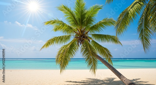 Fototapeta premium Tropical palm tree with vibrant green leaves under a bright sun against a serene turquoise ocean and sandy beach