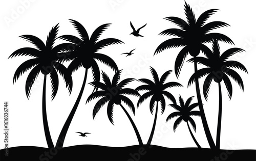 Fototapeta premium Tropical Palm Trees and Birds Black and White Silhouette Illustration