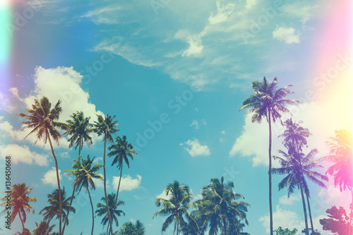 Obraz premium Tropical palm trees at sunny summer day, vintage film stylized with film...