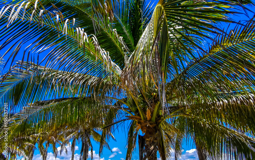 © Arkadi, Fototapeta premium Tropical palm trees coconuts blue sky in Tulum Mexico.