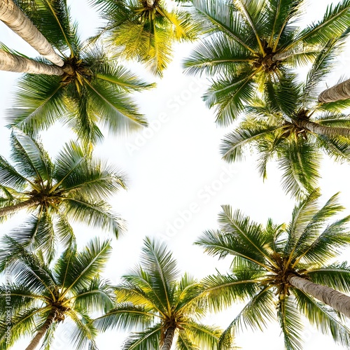 © Anuson, Naklejka premium Tropical palm trees framed against a bright white background offering a unique perspective from below the canopy