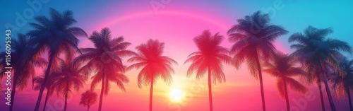 Naklejka premium Tropical Palms Under Rainbow in Vibrant Paradise Scene