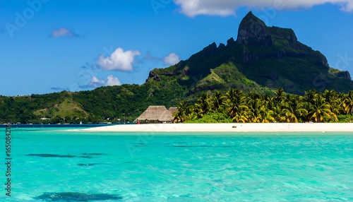 © Ridwan, Fototapeta premium Tropical paradise beach scene with turquoise water and lush mountains.