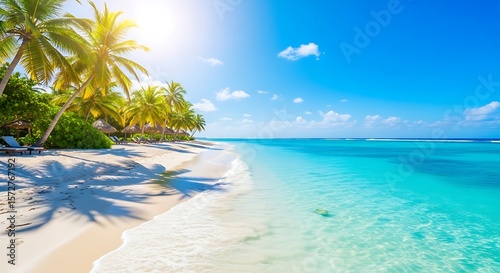 © MOTIWARA, Fototapeta premium Tropical paradise beach with palm trees and turquoise water under a clear blue sky