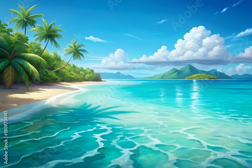 Fototapeta premium Tropical paradise beach with turquoise ocean and lush green island