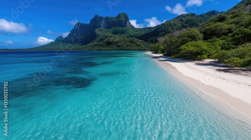 Obraz premium Tropical paradise beach with turquoise water and lush mountains. Tranquil, pristine coastline