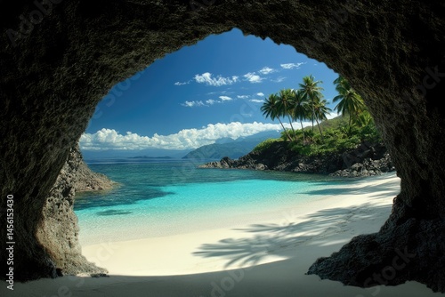Fototapeta premium Tropical paradise hidden within a cave. A breathtaking view of a secluded beach, turquoise water, and lush vegetation through a dark cave opening