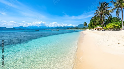 © zerogami, Fototapeta premium Tropical Paradise: Idyllic Beach Scene with Crystal Clear Waters and Lush Palm Trees