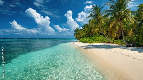 © abdul kahfi, Fototapeta premium Tropical Paradise: Idyllic Beach Scene with Palm Trees and Crystal Clear Waters