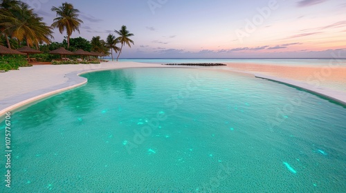 © Narongsag, Fototapeta premium Tropical Paradise Infinity Pool Beach Sunset Palm Trees Ocean Resort Vacation Luxur