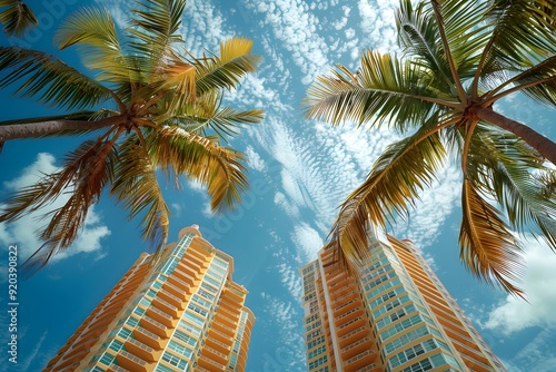 Fototapeta premium Tropical Paradise: Palm Trees and Skyscrapers Under a Blue Sky