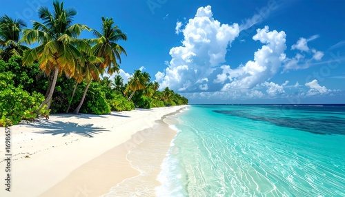 Naklejka premium Tropical paradise. Palm trees frame white sand beach, turquoise water meeting blue sky with fluffy clouds