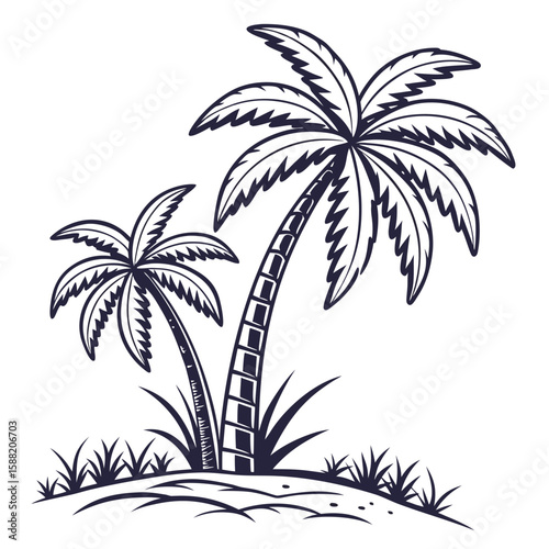 Obraz premium Tropical Paradise Scene with Two Palm Trees on a Sandy Beach with Lush Grass