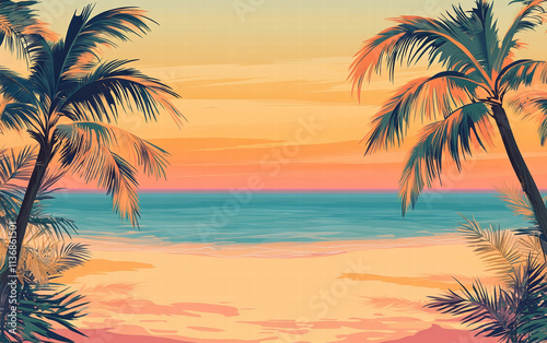 Obraz premium Tropical paradise: Silhouetted palm trees sway against a vibrant sunset over...
