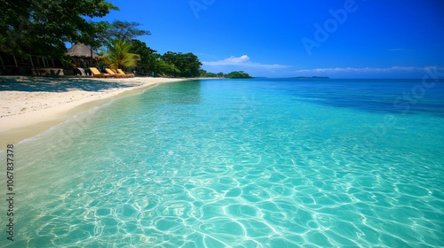Fototapeta premium Tropical Paradise: Tranquil turquoise waters lap the pristine white sands of a secluded beach, inviting you to escape the everyday and embrace the serenity of a tropical paradise.