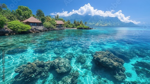 Fototapeta premium Tropical paradise with clear turquoise water, beachfront villas and mountain...