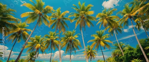 Obraz premium Tropical paradise with tall palm trees against a bright blue sky and...
