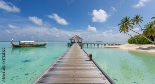 © MST, Obraz premium Tropical paradise with wooden pier and boat in crystal clear water