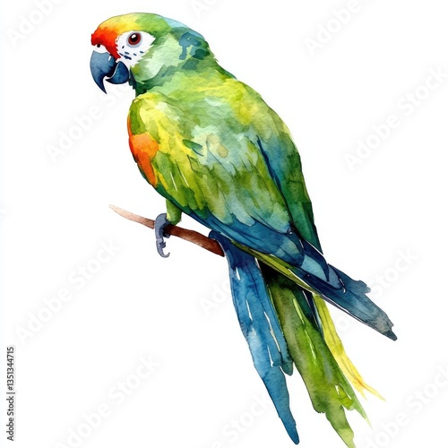 © Popelniushka, Fototapeta premium Tropical Parrot in Watercolor Style. Isolated Fine Art Bird Decoration with Vibrant Green and White Feathers