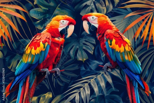 Obraz premium Tropical parrots surrounded by lush foliage in vivid colors, creating a vibrant and lively atmosphere, ideal for nature themed projects and designs