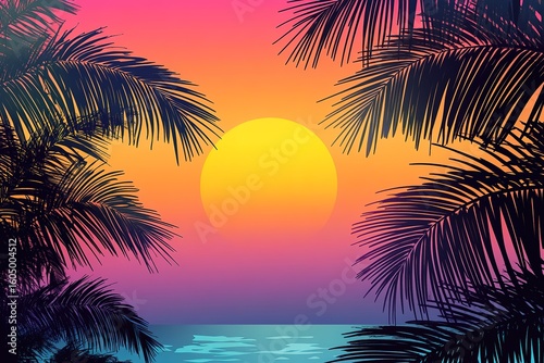 © Blue Rain, Naklejka premium Tropical plants and leaves in sunset background vector illustration with gradient color, 80s style, flat design, bright colors, retro, geometric shapes, digital art, vector graphic.